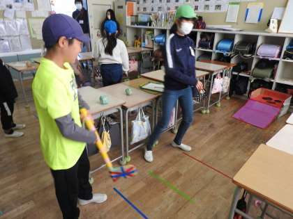 「校長先生もやってみませんか?」 「それでは、私もお願いします。」 子どもたちが優しく丁寧に遊び方やコツを説明してくれました。 説明原稿も自分たちで考え、何度も何度も書き直して、他者に伝わりやすい説明にしたことを特別活動担当の先生が教えてくださいました。 「鶴二小祭り」も鶴二小の良き伝統として、未来へと継承していきたいです。