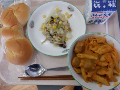 今日の給食は、ツイストパン、牛乳、肉団子入りペンネのトマト煮、しめじとキャベツのソテー です。
