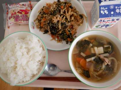 ごはん、五目スープ、変わりビビンバの具、サツマイモと栗のタルト、牛乳です。