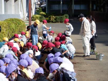 2年生はサツマイモ掘りを、1年生はチューリップの球根を植えていました。