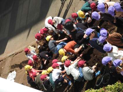 低学年の子どもたちが菜園のサツマイモ堀をしました。お客様と校長室でお話をしていて、子どもたちの歓声が聴こえてこないということは……。 異常な猛暑が続いた気候のせいでしょうか? それとも菜園の土の栄養の問題でしょうか? 先生方が学校応援団さんと相談して、「来年こそは!」 子どもたちを喜ばせることができるようにしたいです。