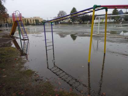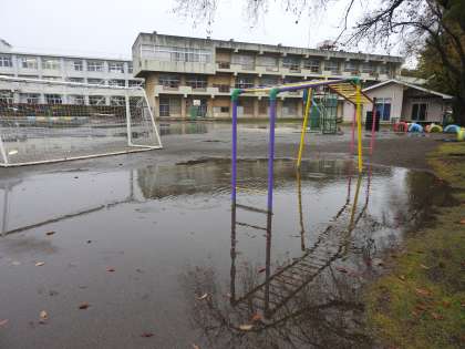 高学年の子どもたちが学習者用PC端末をもって、鶴二小の自分の好きな場所の画像を撮影し、風景画を作成している様子を観察しました。(完成した作品は、関水金属さんの工事用壁面に飾っていただいています。) その時以来、子どもたちのような鋭い観察眼で、鶴二小の面白い風景画像は撮影できないものかしら、と安全点検をしながら画像を撮影しています。 遊具の下にたまった雨水が鏡となり、珍しい画像を撮影することができました。 問題です。鶴二小の校地内で、雨が降ったときに、いちばん深く雨水がたまるところはどこでしょうか?