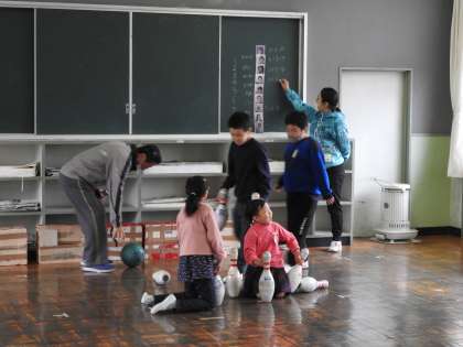鶴二小の南校舎3階にある多目的教室は、とても便利な教室です。 学年集会や、書きぞめ、レク活動などに活用することができます。 残念ながら、雨で校外学習が中止となったなかよし学級の子どもたちと先生方ですが、ボーリングを楽しんでしました。 役割分担がなされ、プレーする子、倒れたピンの本数を数える子、ピンを並べる子、球を返す子……。色々な役割分担が、次々と回ってきます。 画像を撮影していると、男の子が「校長先生。ピンの先頭の部分をねらうと、ストライクが取れますよ。」と教えてくれました。 私も見学させていただいて、「遊び」と「ソーシャルスキル」と「学び」の関係性を学ぶことができました。