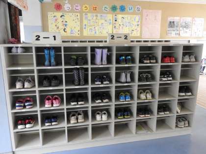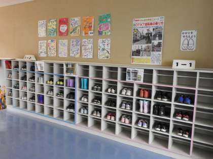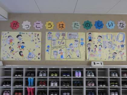 これまでのホームページにも書かせていただきましたが、雨の日の楽しみとして、鶴二っ子たちの【長ぐつ(くつ)】や【かさ】の観察があります。 雨の日は、校庭や通学路に、彩り豊かなお花がたくさん咲きほこります。 今日は、天気予報(午後は晴れる)の関係か、いつもの雨の日よりも長ぐつの子どもの数が少ないようです。 雨に日も、晴れの日も、美しい昇降口です。 子どもたちが一生懸命描いた【がっこうはたのしいな】の掲示物から元気エネルギーをいただきました。 雨の降る中、小さないろとりどりのかさがユラユラ揺れながら、鶴二小に向かってくる様子、とってもかわいらしいです。