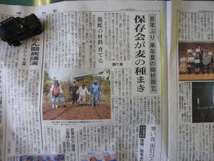 今朝(20日)の埼玉新聞 地域 県北・県西 の欄に「8年ぶり 来年夏の脚折雨乞 保存会が麦の種まき」という記事が掲載されていました。 保存会の皆さんが龍蛇を作成するために麦の種まきを始めたそうです。 私も、今から「脚折雨乞」が楽しみです。