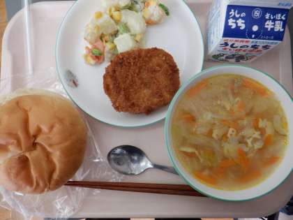 子どもパンスライス、ABCスープ、メンチカツ、ポテトサラダ、牛乳です。