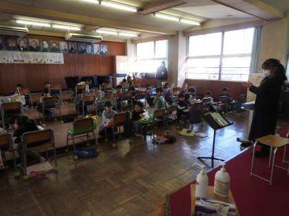 毎日、鶴二小の落ち葉掃除をしてくださっている学校応援団さんにビニール袋(90リットル)を私にプール横まで行くと、子どもたちの歌声が聴こえてきました。耳を澄まして、一生懸命、歌を聴いていると、どうやら、音楽室から聴こえてくるようです。 上履きにはきかえ、音楽室を訪問すると、レジェンド先生とリトルリーダー2年生が歌を歌っていました。 4年生の素晴らしい歌声をお手本として、2年生もがんばっています!
