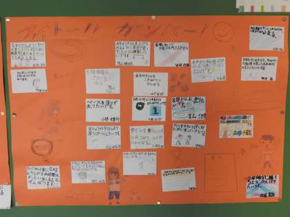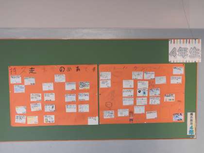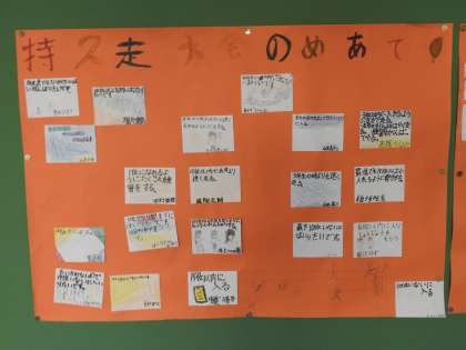 4年生の学年掲示板に「持久走大会のめあて(目標)」の掲示物がありました。 毎日、校長の介護(サポート)をしながら走っている子どもたちのめあてもしっかりと読ませていただきました。 「見通し」と「振り返り」が子どもたち(私たち大人も)を大きく大きく成長させていきます。 「一生懸命はかっこいい!」 「鶴二小プライド一歩前へ!」