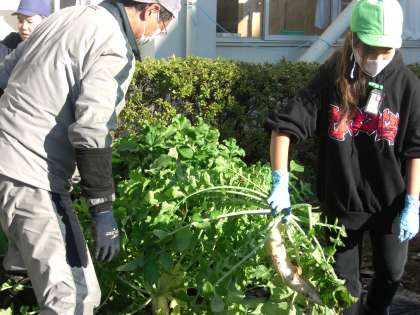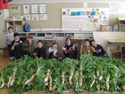 幼い頃の成功体験や失敗体験は、子どもたちの将来にとって、有益な糧(かて)になるのではないかと、いつも考えています。 成功したら、より成功できるように、失敗してしまったら、次は成功するように、どのように修正・改善していくかを寄りそって一緒に考えてあげたいといつも考えています。 なかなか抜けない大きく成長した大根を、5年生と4年生の男の子たちが、かわるがわる引っ張ってる様子を校長室から見守っていました。1本の太くて長い大根に5分ほど、二人で格闘している様子がとてもかわいらしかったです。無事に抜けたことを確認して、二人の笑顔を見てから、学校を出ました。