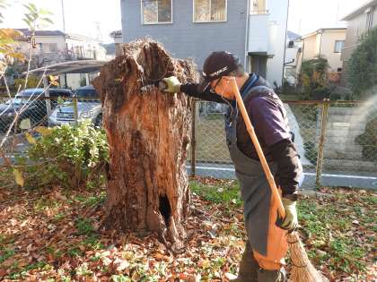 この季節は、掃いても掃いても落ち葉がなくなりません。 校務員さん、学校応援団さん、地域の皆さんが毎日、落ち葉掃き活動を続けてくださっています。 本当にありがとうございます。 昨年度から、少しずつ分解させている、南校舎前の桜の木。 「桜の皮で布をきれいに染める職人さんに関する説明文」を思い出しました。 人間国宝の染色家、志村ふくみさんのお話です。