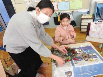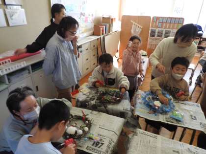 本日はなかよし学級の参観日&保護者懇談会でお世話になりました。 菜園で育てた、サツマイモのツルとコットン(綿花)を使って、親子でクリスマスリースを作成していました。 子どもたちが育てたコットンを使って、あらかじめ、サンタクロースや雪だるま、雪の結晶の飾りを作ってくださったお母さんに「最近は、作品を見れば、作った子の名前が分かりますよ。」とお話しすると、「私も鶴二小によくおじゃまするので、校長先生と同じです。」と嬉しいお言葉をいただきました。 親子でチャレンジして、完成した「自分らしさあふれるクリスマスリース」です。 完成した後に、全員が自分の作品のこだわった場所を説明しました。6年生の子どもが「自分らしさが表現できたところが良かった。」と説明しました。 「自分らしさ」大切に大切に温めたいですね。 本日も子どもたちのためにありがとうございました!