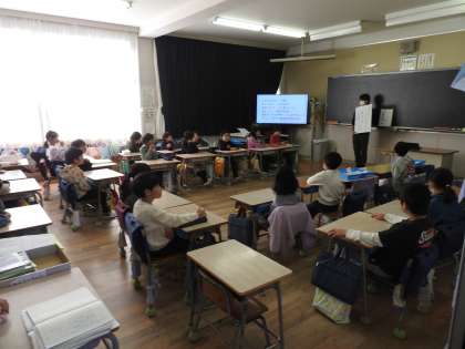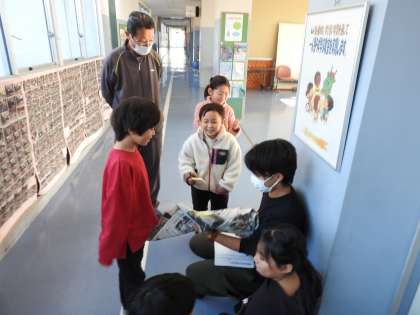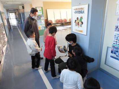 なかよし学級の子どもたちが学級運営補助員の先生に寄りそわれて、交流学級の担任の先生のもとへ大根を運んできました。 「よいしょ。よいしょ。」「先生。どうぞ!」「ずっしりと重い大根ですね。」 「どれどれ?」 「ほら、みんなも持たせてもらってごらん。」 「すごい重いね。」 日陰の廊下ですが、ホンワリ温かい雰囲気でした。