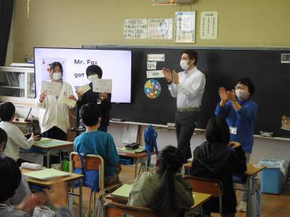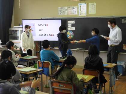 6年生の外国語の授業です。先日開催されたD1グランプリで優勝した子どもたちが表彰を受けていました。 上位に入賞したチームは、新たに動画に記録して、近隣の小学校と授業交流を図るそうです。 表彰状の他に、すばらしい景品が。 周りの子どもたちが、「うらやましぃ〜!」と口をそろえて言っていました。 さて、何をいただいたのでしょうか?