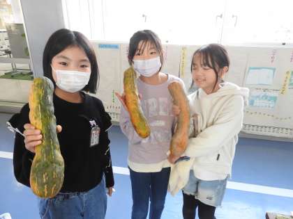 今日は休日明けということで、自主学習ノートを提出にしにくる鶴二っ子が多く、うれしくなりました。 4年生の女の子たちも、自主学習ノート提出と校長先生インタビューで校長室を訪れました。 「校長先生が今日は真面目な服装をしていらっしゃるので、忙しい日なのですね。」「今、この本を読んでいます。」「自主学習ノートがあと〇ページで〇冊目が終わります。」「足のケガが治りました。」 色々な話をしてくれました。 教室に帰るときに、学校応援団さんが育ててくださったかぼちゃをもらって帰りました。 今日も賞状づくり日和です。