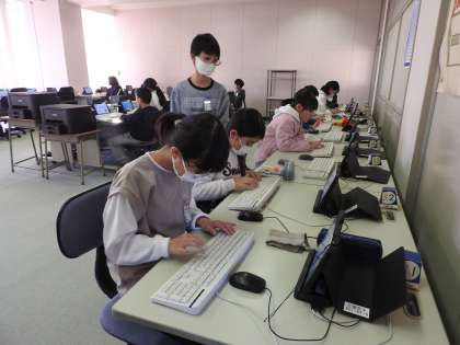 水曜日のクラブ活動や委員会活動をご紹介したいのですが、水曜日の午後はお客様や関係諸機関との電話対応で、なかなか子どもたちの様子を観察できません。 昨日は、時間を確保することができたので、3つのクラブ活動におじゃましました。 まず、コンピュータクラブに行きました。 南校舎の3階の廊下の真ん中編まで歩いていくと、PCルームから、タイピングの音が聴こえてきました。 そ〜っと入り口の窓から中の様子をうかがうと、子どもたちが画面に向かって、黙々とタイピングをしていました。 ブラインドタッチ(校長はできません。キーボードを見ずに、文字を入力すること。)をしている子どもたちもいて、すごいなぁと思いました。 クラブ長の子どもが、丁寧に分かりやすく活動内容を説明してくれました。 子どもたちの集中力とタイピング能力に脱帽です。