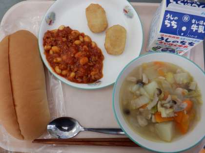コッペパンスライス、チリコンカン、チキンナゲット、