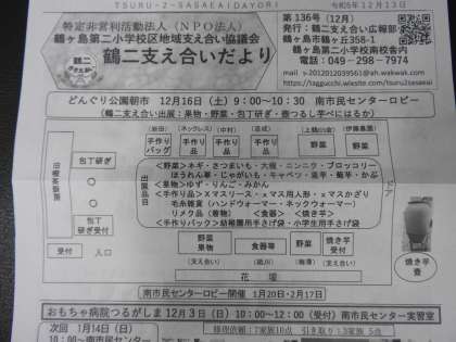 明日(16日)は待ちに待った、鶴二小ビッグサポーター支え合い協議会さんの開催する「どんぐり公園朝市」です。 南市民センターのロビーで開催されるそうです。 野菜や手作り品、食器等の販売があるとのこと。包丁研ぎも有料ですがやっていただけるとのことです。 私もスケジュールを調整してうかがう予定です。