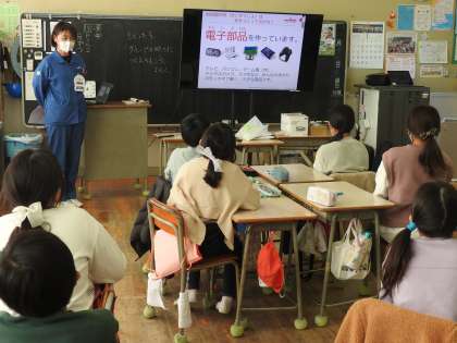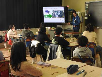 3時間目の授業開始のチャイムが鳴ると同時に、埼玉村田製作所さんとのコラボ授業が始まりました。 ごあいさつをした後に、村田製作所さんの世界に誇れる「ものづくり」についてご説明いただきました。 子どもたちはもちろんですが、校長の私も楽しく教えていただきました。 授業終了後に子どもたちにインタビューしたところ、村田製作所クイズの中に、村田製作所さんが生産している電子部品を並べると、地球何周でしょうか?というクイズが印象に残っているというコメントが多かったです。 みなさん、どのぐらいだと想像しますか? なんと、地球15周だそうです。 すごいぞ! 世界の村田製作所さん!
