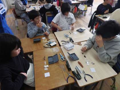いよいよ、子どもたちが待ちに待った電子オルゴールづくりの始まりです! まず、埼玉村田製作所のスタッフの方々が、使用する道具とキットを配布してくださいました。 説明を聴きながら、キットの袋を開けている子どもたちのドキドキ感がカメラのレンズ越しに伝わってきました。 作業を正確に進めるために、分かりやすい説明を最後まで聴いて、机の上に道具と部品をしっかり整理整頓して並べていた鶴二っ子たちです。 先生方の日頃の支援が、こういう場面ではっきり表れるのだなぁと感じ、感謝しました。