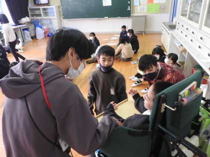 今日は近隣の特別支援学校の児童さんが交流授業に来てくださいました。前回、会ったときよりも、鶴二っ子たちと同じように大きく成長していたことを嬉しく感じました。 教頭先生の「自分の好きな色の画用紙を選んでください。」という語り掛けに、6年生の子どもたちが温かく交流を深めながら、「好きな色」を聞き出す豊かな感覚のコミュニケーションにココロが温かくなりました。 やはり、鶴二小トップリーダー6年生は鶴二小の誇りです。