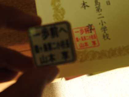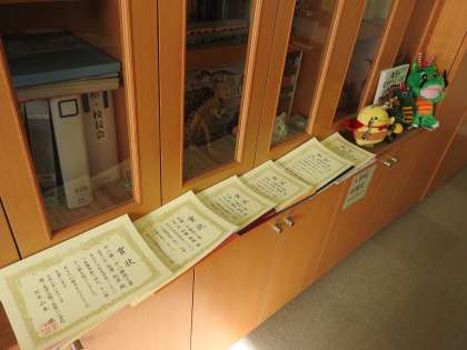 1年生の子どもたちと先生方が一生懸命、体育の授業に臨む声を聴きながら、校長室で、自主学習ノートの賞状を作っています。 私が予想して以上の数の子どもたちが【自分のペース】で自主学習ノートに取り組み、準備した賞状用紙がなくなってしまいました。 事務室の先生が速やかに教材屋さんに注文してくださいました。 先生方や保護者の方々の温かい励まし、労いの言葉が、子どもたちの「自主性・主体性」を育みます。 引き続き、一緒に、子どもたちの「知的好奇心」をこちょこちょしてください。 今日も、自主学習ノート賞状づくり日和です。 10冊以上がんばった子どもたちには、「鶴二小SDGsプロジェクト」で学校応援団さんが古い着物から作ってくださった小物をプレゼントしたいと思います。 レジェンド先生が作ってくださった「一歩前へ ハンコ」も子どもたちから大変好評です。