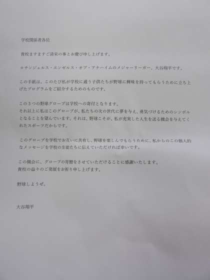 【大谷選手からのグローブに添えられていたお手紙を紹介します。※鶴二小では、全てのクラスに印刷して、掲示しています。】 学校関係者各位 貴校ますますご清栄の事とお慶び申し上げます。 ロサンジェルス・エンゼルス・オブ・アナハイムのメジャーリーガー、大谷翔平です。 この手紙は、このたび私が学校に通う子供たちが野球に興味を持ってもらうために立ち上げたプログラムをご紹介するためのものです。 この3つの野球グローブは学校への寄付となります。それ以上に私はこのグローブが、私たちの次の世代に夢を与え、勇気づけるためのシンボルとなることを望んでいます。それは、野球こそが、私が充実した人生を送る機会を与えてくれたスポーツだからです。 このグローブを学校でお互いに共有し、野球を楽しんでもらうために、私からのこの個人的なメッセージを学校の生徒たちに伝えていただければ幸いです。 この機会に、グローブの寄贈をさせていただけることに感謝いたします。貴校の益々のご発展をお祈り申し上げます。 野球しようぜ。 大谷翔平