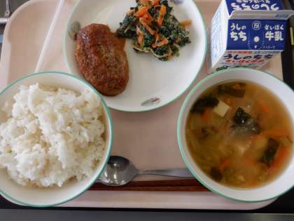牛乳、ご飯、さつまいもの味噌汁、おろしハンバーグ、ほうれん草のごま和え