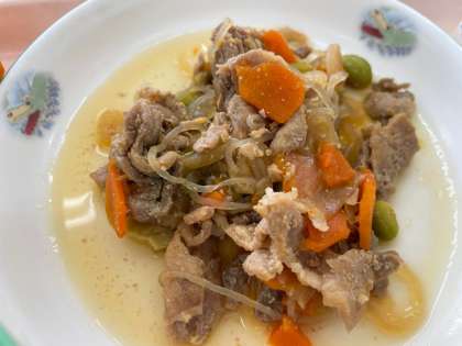 その名の通りに「豚丼の具」をごはんの上にのせて食べました。相性抜群。ごはんが進みます。高学年のクラスに行くと、おかわりの行列ができていました。