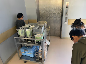 職員室前で、給食のワゴンを運んでいる2年生に会いました。