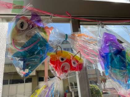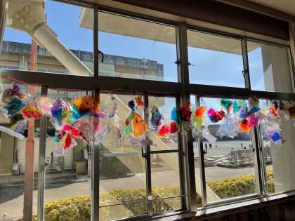 セロハンの袋の中には、切ったり、くしゃくしゃにしたり、モールで束ねたり…色々な形の色セロハンが入っています。可愛いお目目もそれぞれ個性的。1年生が思い思いに作って楽しんでいたのが容易に想像できました。