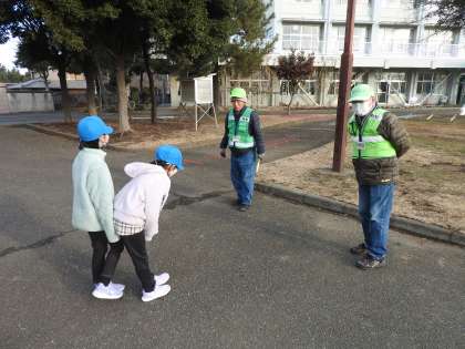 「校長先生。雪が降った次の日の校庭で遊ぶ子供たちの様子を見た地域の方々が素晴らしい光景だったとおっしゃっていましたよ。」学校応援団さんからすばらしい報告をいただきました。 「子どもたちや先生方が雪を踏んでとかしてくれたので、校庭が復活しました。」 鶴二小の先生方・保護者・地域の方々の力を結集し、子どもたちにより豊かな体験をさせてあげたいと校長はいつも願っています。 その校長の願いを実現してくださっている皆様に感謝・感謝・大感謝です! いつもお世話になっている学校応援団さんに元気よくあいさつする3年生です。
