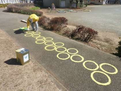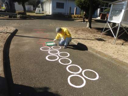 先生方と「子どもたちが楽しみながら 体力向上 や 学力向上 できる仕組」を考え、教育活動の中に取り入れています。 休み時間や放課後に子どもたちはもちろん、地域の方々も活用してくださっている「鶴二小ケンケンパ」。 今日は天気が良かったので、スクールサポートスタッフの先生と一緒にペンキを塗りました。 夏休みの奉仕作業のときのペンキのあまりを有効活用してペンキを塗りました。 休み時間になると子どもたちが寄ってきて「校長先生。〇〇先生。いつもありがとうございます!」「今度の色も明るくていいですね。」 なんてほめ上手な鶴二っ子たちなのでしょうか? 大人だってほめられると、とてもうれしくなります。 心の中で次は校長が「スパー、ウルトラ、褒めホメ返し」をしてやろうと思いました。