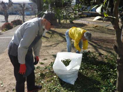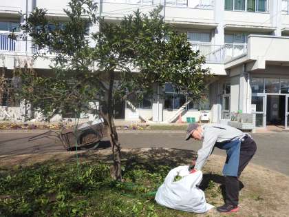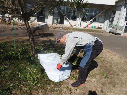 昨年度、色々な方々から、ミカンの木の剪定方法を教えていただき、おそるおそる枝の剪定を行いました。 その結果、令和4年度よりも「大きなミカン」を収穫することができました。 今年は、昨年の経験をいかし、さらに剪定する枝をしぼりました。 肥料についても研究して、令和6年度さらに「大きなミカン」を子どもたちと一緒に収穫できるようがんばりたいと思います。 枝をチョキチョキ剪定していると、校務員さんとスクールサポートスタッフの先生が剪定した枝を集めてくださいました。 チームワークのすばらしいチーム鶴二小です。 もちろん、鳥の巣はそのまま残してあります。 アゲハ蝶が卵を産み付けられるような工夫もしてみました。