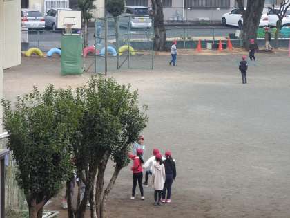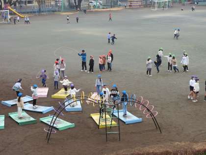 業間休み、子どもたちと先生方が校庭で遊びます。 雨が降った後でも、遊ぶことができる強い鶴二小の校庭です。 子どもたちが縄跳びの技を見せて「ドヤ顔」をしてくれました。