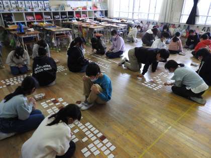 お休みの先生がいるということで、6年生の授業を二コマいただき、トップリーダー6年生たちと「中学校の予習をしよう!」ということで、「百人一首」をしました。 「覚えなくていいんだよ。」と言っているのですが、「校長先生。覚えてしまいました。」と一人一人がそれぞれのコツをつかみはじめているようです。 次は「清少納言の歌」というと「はい!」と取り札を取る子どもたちもいます。 下の句が「ひと〜」や「わが〜」という歌がたくさんあることも分かってきたそうです。 鶴二小の子どもたちは、お話をしっかり最後まで聴くことができるので、ぐんぐん力を付けていきます。