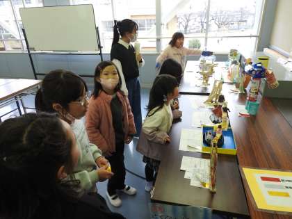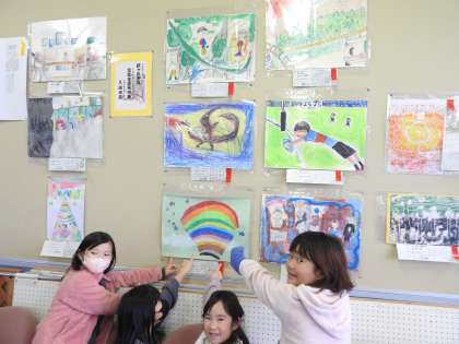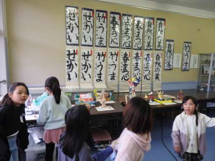 提出する自主学習ノートに、毎回、学習した授業の内容はもちろん、自分の趣味(髪型や服装などのファッション、料理、日記など)をわかりやすくまとめる子どもたちもいます。 物語の登場人物の相関図や、恐竜や動物、昆虫などの豆知識も調べてまとめる子どもたちもいます。 6年生の女の子が「ファッション」についてまとめました。 「次は、いよいよ9冊・10冊ですね。そういえば、あなたの図工の作品が共有スペースに展示されていますね。」 女の子と共有スペースに行くと、1年生と3年生の子どもたちがいました。 「校長先生。〇〇さんの作品は上手なんだよ。」「どれどれ? あぁ、本当に上手ですね!」 「校長先生。私の作品が二つ飾られています。」「どれどれ? あぁ、本当だぁ! 素晴らしいですねぇ。」 子どもたちの作品から、たくさんのエネルギーをいただきました。