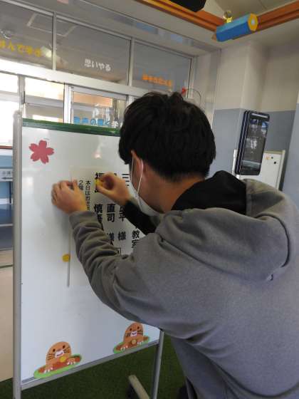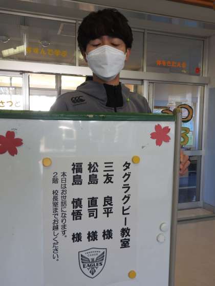低学年の子どもたちは「サッカー」で。中学年の子どもたちは「野球(西武ライオンズ)」で。そして、高学年の子どもたちは……。 高学年の子どもたちから、「校長先生。低学年や中学年のみんなは、サッカーや野球のプロから教えていただいたのに、高学年は……。」とお願いされていたので、色々な人脈をたどって、高学年の子どもたちは「ラグビー(タグラグビー)」のゲストティーチャー(今回のご縁を結んでくださった校長が尊敬する校長先生もお見えになります。)をお迎えすることにしました。 横浜キャノンイーグルスの皆さんが明日、鶴二小に来校なされます。 9時40分の2時間目スタートです。 お楽しみに。 ラグビー好きな体育主任の先生は、明日が待ちきれず、お客様のウエルカムボードを準備していました。