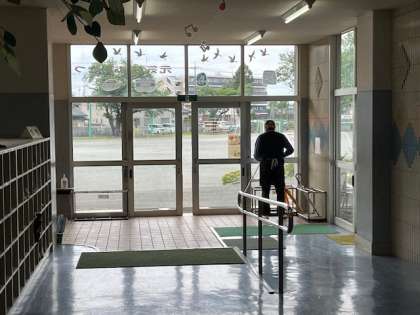 毎日7時半頃には、昇降口の鍵を開けて、子どもたちが気持ちよく校内に入れるようにドア付近も靴箱の前も掃除してくれています。