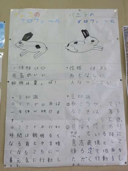 子どもたちが、チョコとバニラ(鶴二小の愛兎のことです。)のことについてお話していました。 毛がモフモフなのか? 毛がフカフカなのか? 問題です。 どちらが、チョコで、どちらが、バニラでしょうか?