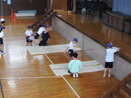 今日はあいにくの雨模様となったので、体育館でできる新体力テストの種目を実施しました。 「〇〇のコツ」について、子どもたちと先生方が再確認をしていました。 成果のほどは?