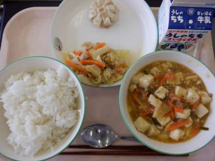 ごはん、マーボ豆腐、彩の国ニラまんじゅう、キャベツとツナの炒め物、牛乳(16日)