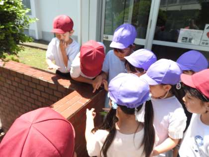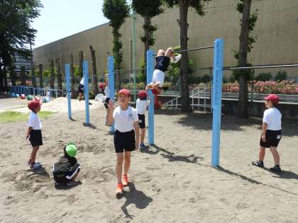 「校長先生。カタツムリがいますよ。」「はいはい、どこどこ?」 子どもたちに導かれ、体育館の入口へ行きました。 「あぁ、すごいねぇ。生きているカタツムリをみたのは久しぶりですよ。ありがとうね。」 子どもたちの観察眼から、今日もたくさんのことを学んでいます。 鉄棒大好き、鶴二っ子たちです。