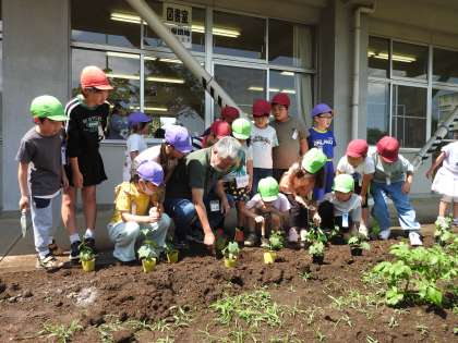 スクールサポートスタッフの先生が、昼休みに外に出てきた子どもたちに呼びかけます。「だれか、ヘチマの苗を植えるのを手伝ってくれますかぁ?」 「はぁ〜い!」 子どもたちが校庭から図書室の前に集まってきました。 「それでは、先生が、ヘチマの植え方のお手本を示します。」 集中して、スクールサポートスタッフの先生の説明に耳を傾ける子どもたちです。