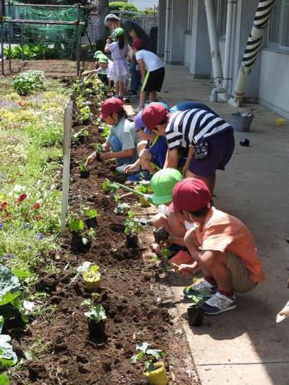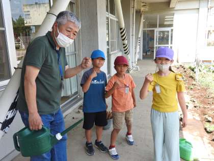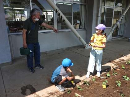 昼休み終了5分前のチャイムが鳴ると、子どもたちが手を洗って教室へ戻っていきました。 ところが、3人の子どもたちが残って、スコップや植木鉢などの片づけを始めました。 スクールサポートスタッフの先生と「あなた方は、なんて素晴らしい鶴二っ子たちなのでしょう!」。 片付けが終わると、「ありがとうございました!」と元気に教室にっ戻っていきました。「こちらこそ、最後までどうもありがとうございました!」 鶴ヶ島市の「緑のカーテンプロジェクト」初日から、たくさんの幸福感を子どもたちと先生方と味わうことができました。 どうもありがとうございます!