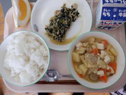 野菜たっぷりの豚汁に食物繊維が豊富な白滝と、栄養満点の給食です。