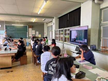 6年生は「ヒトや動物の体」についての学習で、でんぷんの変化の実験準備をしていました。理科室の後方に用意されたモニターには、板書が写されていました。後ろの方に座っている児童がモニターを見ながらノートをとっていました。