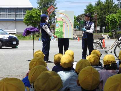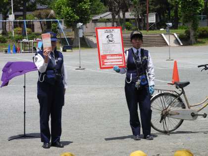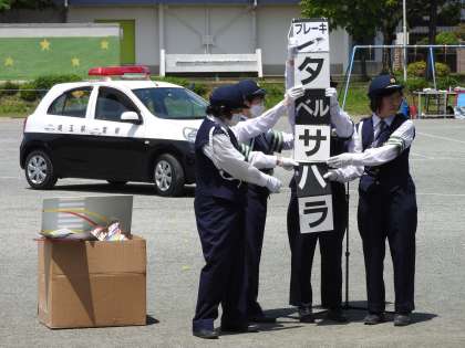 西入間警察署の警察官の方々と交通安全指導員さんたちが、子どもたちに分かりやすく丁寧に教えてくださいました。「ブタバラサハラ」とは何でしょうか? お子さんが帰宅したら、お子さんに質問してみてください。 自転車の点検に使う言葉のようです。