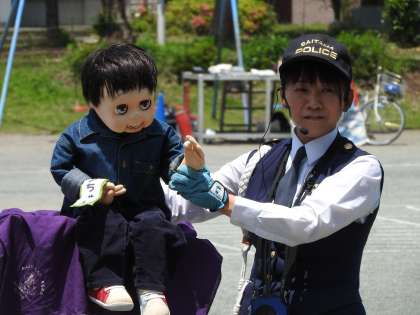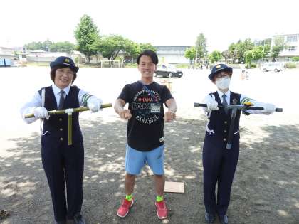 けんちゃんが警察官の方と一緒に子どもたちに「交通安全」について教えてくださいました。 子どもたちに大人気のけんちゃんです。 ヤオコーの前で毎朝、子どもたちを温かく見守ってくださっている交通安全指導員さんからもご指導いただきました。