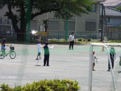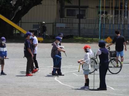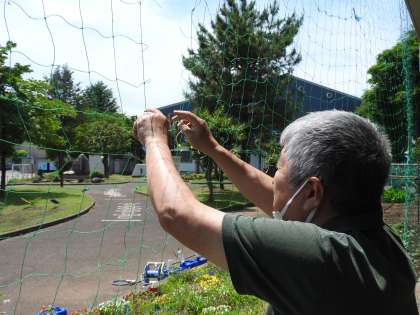 模擬ハンドルを真剣に握りしめて、自転車の正しい乗り方のご指導を受けます。 保健室の方向にふと目線を合わせると、スクールサポートスタッフの先生が、ヘチマ用のネットの準備をしてくださっていました。