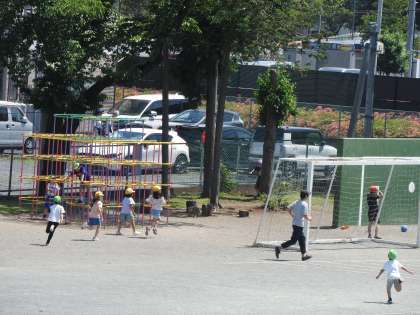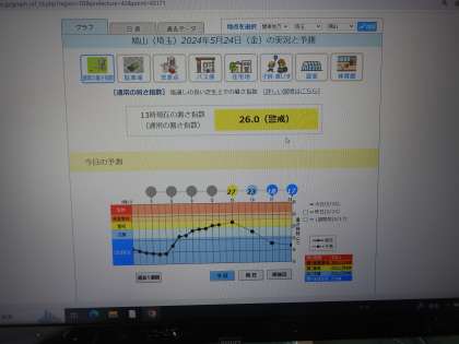 朝起きて、天気予報で「高温」の予報が出ていると、出勤してから1時間ごとに、先生方と「環境省 熱中症予防サイト」のWBGT(熱中症指数)と「校庭に設置した熱中症計」の数値を比較しながら、熱中症対策について子どもたちに連絡を流します。 今日(24日)昼休み現在は、まだまだ大丈夫そうです。 子どもたちも先生方も元気に遊んでいます。